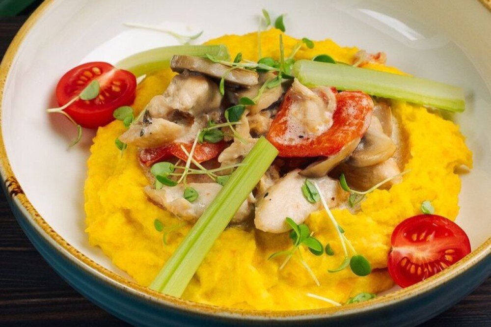 Нежное фрикасе из куриного филе в сливочно-бульонном соусе с шампиньонами, болгарским перцем и чесноком, подается с бабушкиным пюре, томатами черри и микрозеленью.