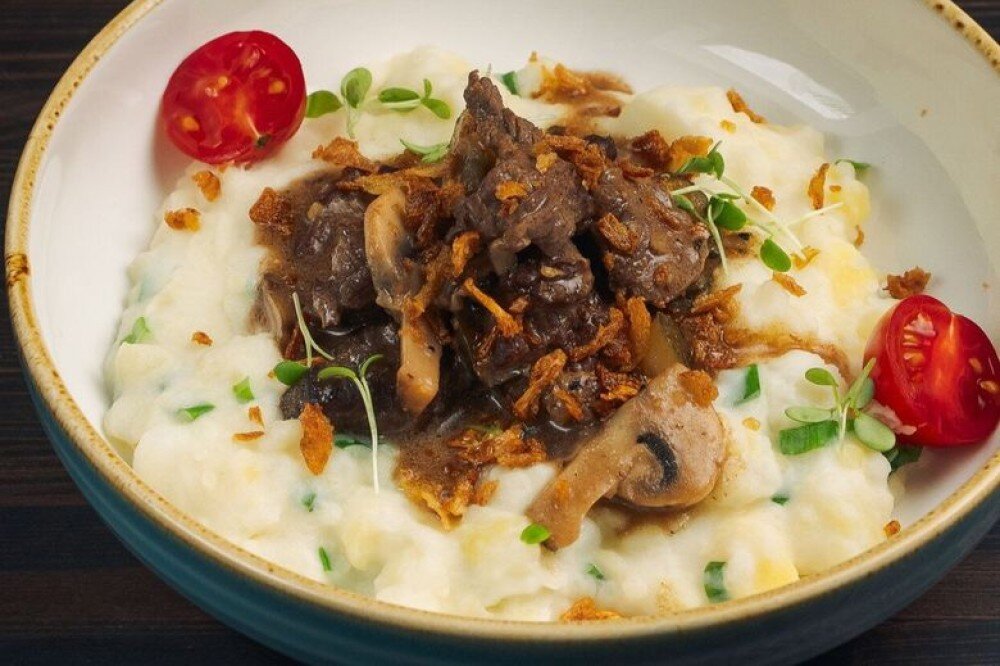 Филе говядины в нежном сливочном соусе с трюфелем и маринованными огурцами, подается с толченым картофелем, помидорами черри, луком фри и микрозеленью.