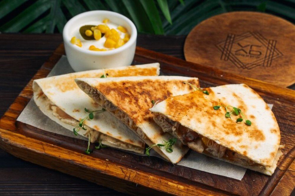 Сочная рваная курица в пшеничной тортилье с Чеддером, кукурузой и фасолью, соусом тар-тар и сметаной, зелёным луком и острым халапеньо.