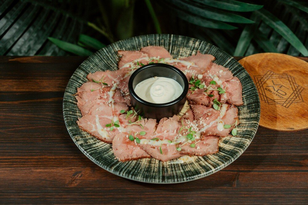 Нежный ростбиф под соусом Цезарь, медово-горчичной заправкой и соусом Фо Бо. Итальянская классика в авторской интерпретации.