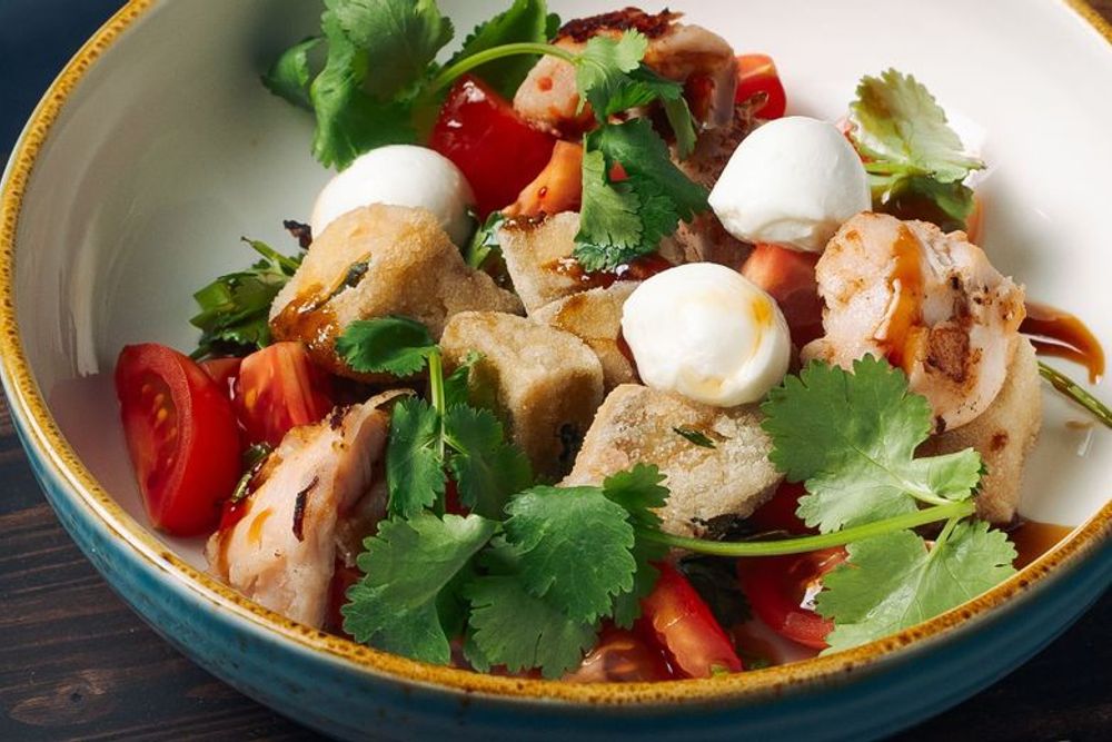 Нежный кролик с хрустящими баклажанами, моцареллой, зеленью и свежими томатами в соусе свит чили.