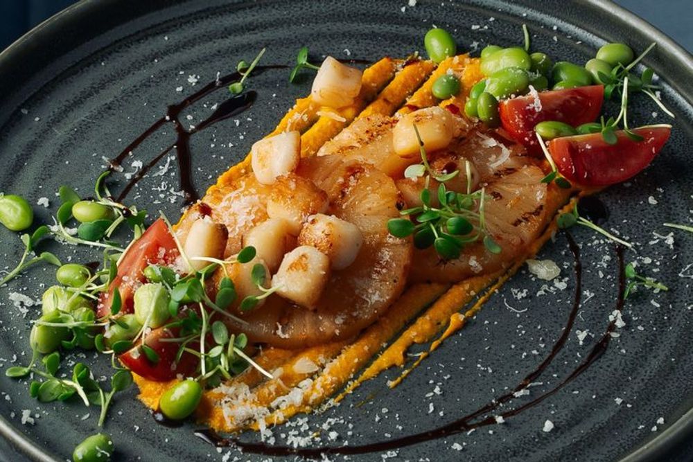 Нежные гребешки с карамелизированным на гриле ананасом, воздушный морковный мусс и бобы эдамаме.