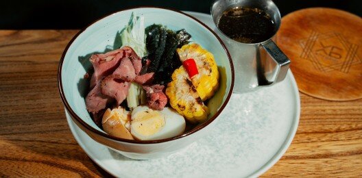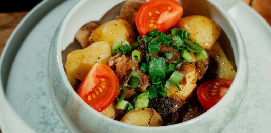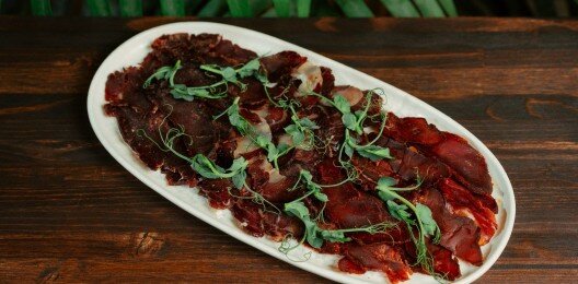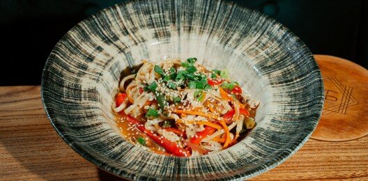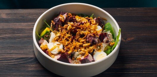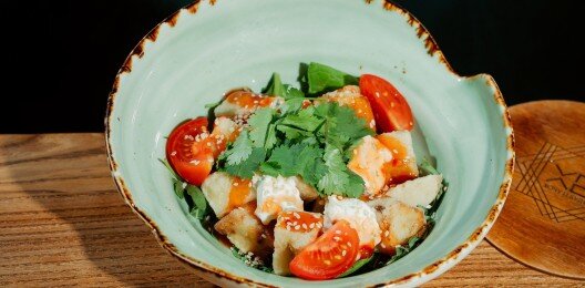 Стейк-салат с битыми огурцами, руколой, жареным луком, томатами черри и насыщенным ореховым соусом.