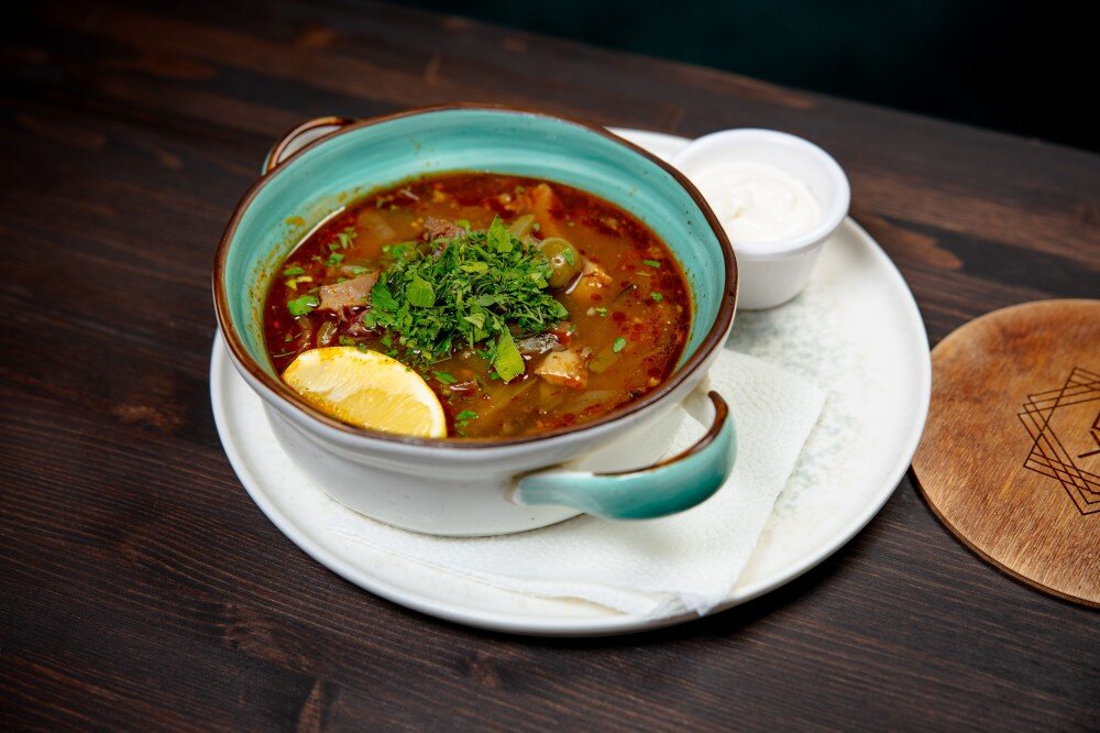 Наваристая солянка с пятью видами мяса и деликатесов: нежный язык, ростбиф, бастурма, балык и буженина. Подается со сметаной и лимоном.