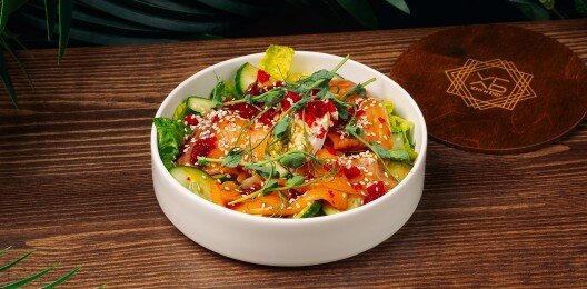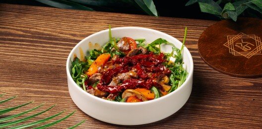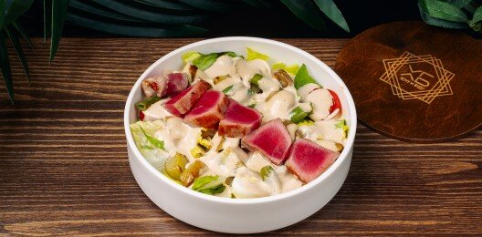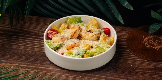 Классическая рецептура с миксом салата, обжаренным куриным филе, крутонами, томатами черри, сыром пармезан, фирменным соусом цезарь по авторскому рецепту шефов.