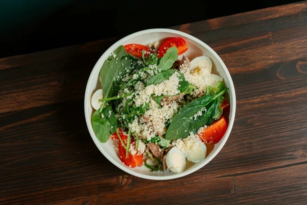 Салат с нежным говяжьим языком, томатами черри, зеленью, перепелиным яйцом и Пармезаном под медово-горчичным соусом.