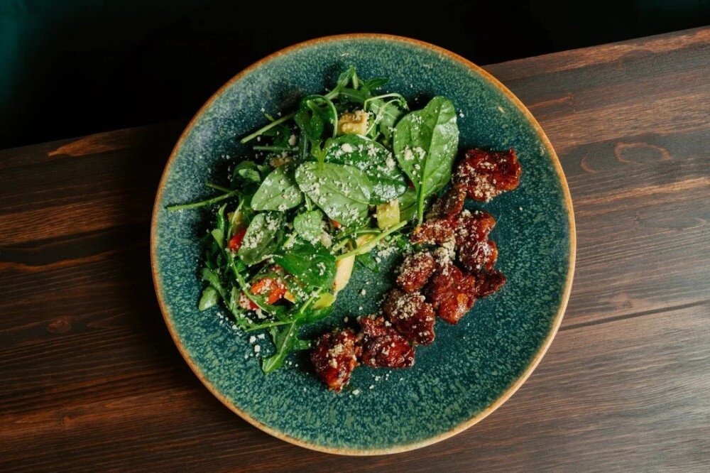 Питательный салат с куриной печенью в ароматном маринаде, сочными томатами, нежным авокадо, свежей зеленью и Пармезаном.