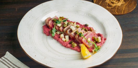 Татаки – японский способ приготовления, заключающийся в короткой термической обработке. Рыба сперва маринуется в авторском маринаде на основе меда, соевого соуса, затем слегка прижаривается, и подаётся с рукколой, томатами черри и базиликовым соусом. В этом японском блюде неповторимый вкус тунца и лосося раскрывается в полную силу.