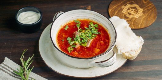Борщ с мраморной телятиной, копченой сметаной и салом